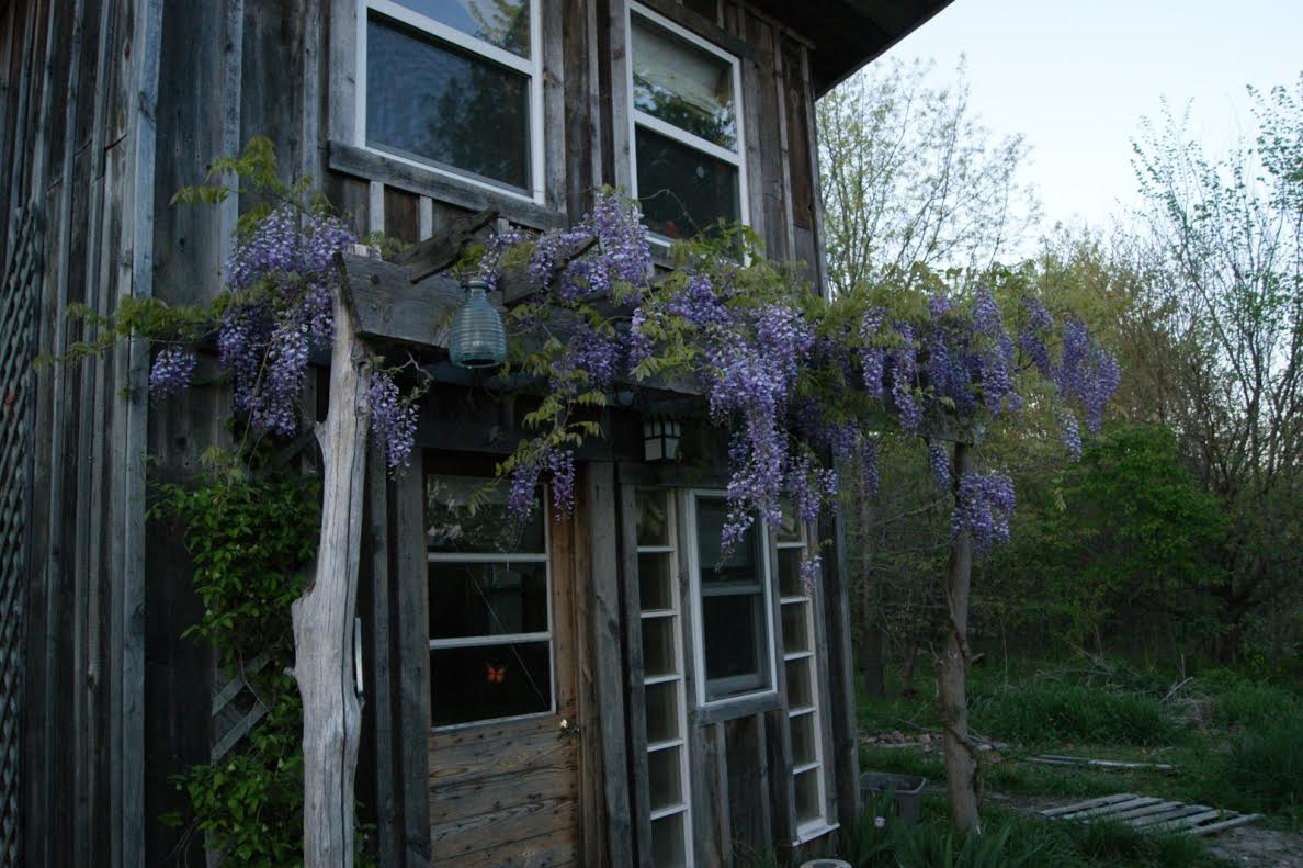 These days, Wisteria serves as a rental house, and as an example to newcomers to the village of what radical recycling can look like. Dan’s finishing touch was a wooden arbor over the front door, which he planted with wisteria vines. In late summer, they explode with deep purple blooms that last for weeks.