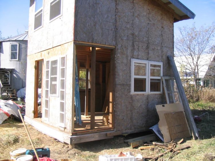 The first order of business was installing a foundation for the structure. To do this, Dan buried 6-foot long posts made of locally harvest Osage orange round wood timber. These act like concrete piers in traditional pier foundation construction. (Dan wouldn’t recommend this method to others, mind you – the house has been gradually sinking over the last several years, and he recently had to repair a snapped lag bolt by jacking up the house and inserting some heavy-duty shims, with the help of his dad.) Oaken horizontal supports form the framework for standard dimensional lumber floor joists.