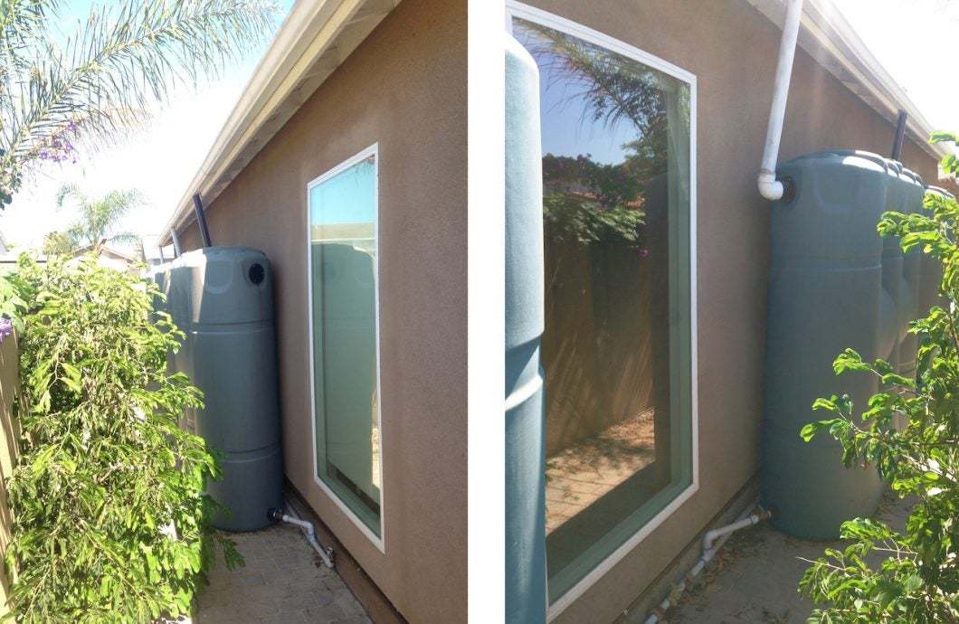 Rainwater is collected in containers outside and the shower, sink, and laundry water are treated with a greywater system to reuse in the garden.
