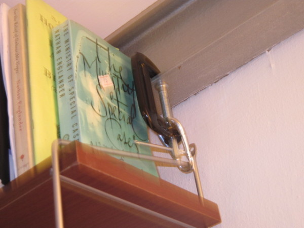 - Hang as much as you can from the walls, ceilings, and rafters: I am lucky that my studio has exposed metal beams. Instead of taking up valuable floor space with book shelves, I bought cheap wall mounted modular book shelves and hung them from a beam using C-clamps and karabiners. I have a teeny, tiny bathroom with no space for shelving, so I store my bathroom toiletries in a wire mesh basket that I screwed to the bathroom wall.