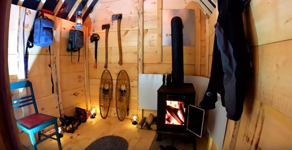 “We built a lightweight DIY cabin that is designed to fit together in a single day. This makes it a great low-cost option for those wanting to build their very own cabin, especially in remote areas where it is difficult to haul in heavy materials. We used a snowmobile to transport our cabin materials to the building site, where we assembled them. Our building materials consisted of barn boards, 2″x4″ lumber, cedar strapping, tarp, vapor barrier plastic, and screws. We built the cabin upon 3 small cedar logs, which came from a nearby fallen tree.”
