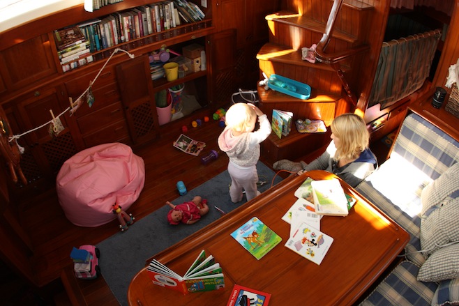 Pat and Ali Schulte have been profiled on the Tiny House Blog before when they lived the nomadic life on their 35-foot catamaran and in their 1958 Volkswagen panel van. Now they are in the process of fixing up a 43-foot Spindrift sailboat and living on it with their two children: 16-month-old Ouest and another one who is on the way.