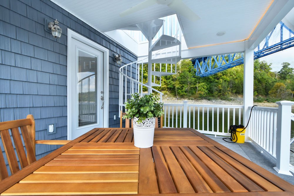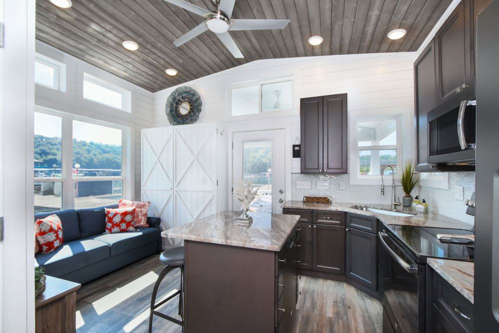 I’m really excited about this tiny boat. We build boats where the propulsion is optional – so we can build just a floating home, or a fully powered houseboat (with engines, generators, thruster, and helm); it’s totally optional based on what the customer wants. We usually build much larger floating homes and houseboats but I convinced my dad that the tiny revolution is where it’s at. The ‘tiny’ is just over 400sqft – it is 16′ wide and 52′ long from bow to stern swim platform. So it has plenty of outdoor space: a 12’x16′ front porch, a 10’x16′ bach porch with spiral stair case and access to a spacious 24’x16′ roof deck! The house structure itself is 15’x26′ with 2 bedrooms (king bed in master suite, and one twin/one full in the lower stateroom) and one full bath. For being only about 400sqft this boat has actually has a bathtub, stackable washer/dryer combo, a double-door 36″ GE refrigerator, and a full-size dishwasher! We can build these boats to order in as little as 90 days and ship them anywhere in the USA. We manufacture our boats from top to bottom in Somerset, KY including building our own aluminum hulls which are suitable for fresh and/or saltwater applications. HGTV has already filmed the build on this boat and it will air on Tiny House big Living on HGTV on November 13th and DIY Network on November 2nd. At Harbor Cottage, our goal is to make living on the water, house-boating and recreating on our waterways affordable and accessible for all Americans!
