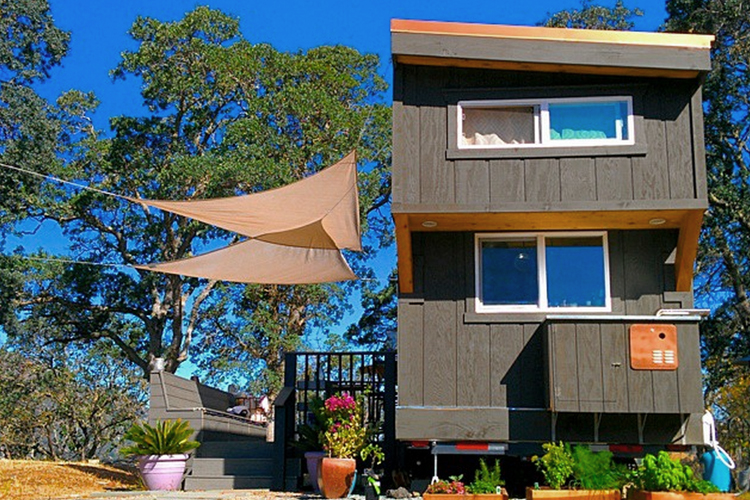 If you use a patio umbrella make sure you get one that tilts so you can position it well to keep the sun off. You can also drape a shade cloth attached to your tiny house over a patio umbrella as an external anchor point. We’ve had some great little setups with a screen house outdoor kitchen holding up a shade tarp attached to the trailer. Make sure your attachment points are good and strong, it’s amazing how much pull a little tarp or shade sail can exert in a wind.