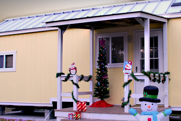 It is quite easy to build a standalone set of steps with accompanying porch. If your THOW does not have a pre-fastened set of steps or a small porch you simply want to build a traditional set of rise ‘n run steps that line up just under the lip of your door jam. The entire unit would be anchored by 4-4″ x 4″ corner posts as well as 2 or 4 more for railing depending on what your desired look would be. The overhang (called a lean-to in this case because it sort of leans up to the pitch of the THOW roof) is then framed on to the top of the 4-4″ x 4″s and gridded with 1″ x 4″ runners. On top of those you can attach any sort of roofing ranging from simple, corrugated metal to heavier and more residential sheathing, felt, and shingles. The finished look as seen below gives some area to decorate, landscape around, and enjoy a cold beverage during the day yet out of the sun!