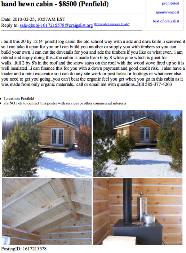 Chris just let me know about this affordable hand hewn log cabin he found on Craigslist and I thought I should get it up while it was still available. This one is also in New York. You can view the Craigslist link here. I am really impressed with Bills quality of work and want to get in touch with him and learn more about his work. So I may have a post on him at sometime in the future.