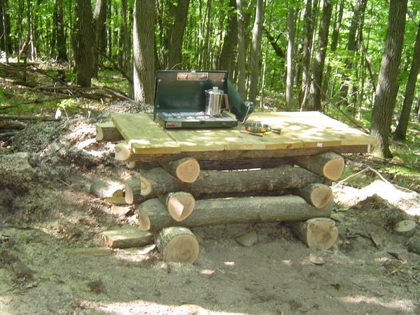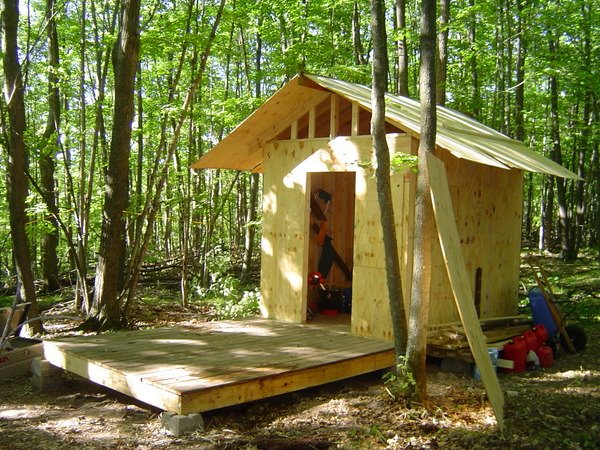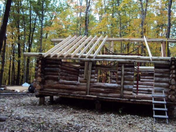 Between 2007 and 2009 I cleared our land, built a bunkhouse, installed a foundation, built my cabin walls, learned to rig, installed the ridge pole, installed the roofing, and started on some of the outbuildings. On occasion, friends and family members have helped. Normally I worked alone. Very few materials have been purchased and I take pride in making the things I need from the resources on our property.