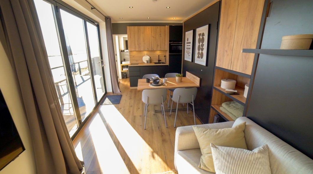 An extensive solar panel system can also be installed on the roof. The German modular tiny home has an additional green feature, electric vehicle charging. BLOXS plans to take this one step further with bidirectional charging. This means your EV can act as an external house battery. So the stored energy from the car will go back into the house again.