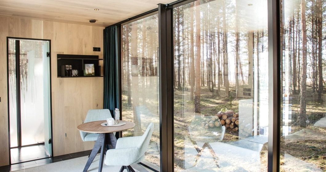 The ÖÖD House house has these views in spades with floor-to-ceiling windows on three of the steel-framed walls. The walls are mirrored to reflect the outside and maintain the interior temperature. The ÖÖD can be ordered as a house, office, or sauna.