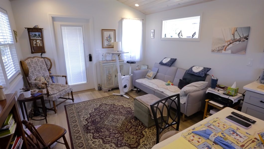 She filled her tiny home with a heartfelt mix of her most beloved family heirlooms, hobby supplies, and small space-friendly furniture. For instance, in her living room, Peg added a small display case built by her father. It’s filled with curated memorabilia. Next to her loveseat sits a compact exercise bike. She uses this three times a week as part of her physical therapy.