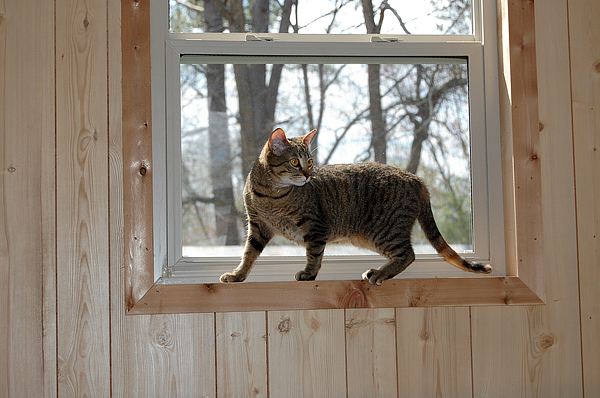 Kathleen, All the cats and kittens and two dogs live in the cabin with me. 10 cats and kittens room in the loft. My 17 yo calico sits high above my two under 50# cat-friendly dogs in the bedroom. The loft crew come out to play and eat in groups in the living room. The other three eat in their bedroom. When we have lightning and thunderstorms(frequently during this time of the year) the dogs join me in the living room because Peek is terrified of storms. Her full name is Peek-a-boo named for her timidity.