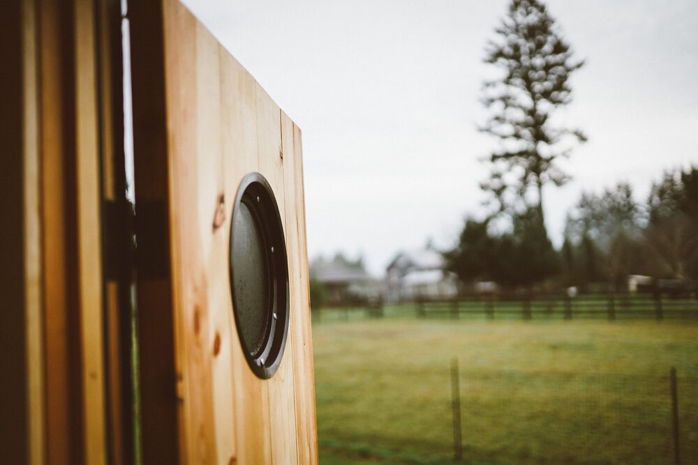 Each Bivvi Cabin comes equipped with a signature triangle picture window, natural ventilation openings, stained and sealed tongue-and-groove cedar siding, full insulation, a custom-made locking door with premium hardware, door porthole window, and quality long-lasting exterior metal roofing.
