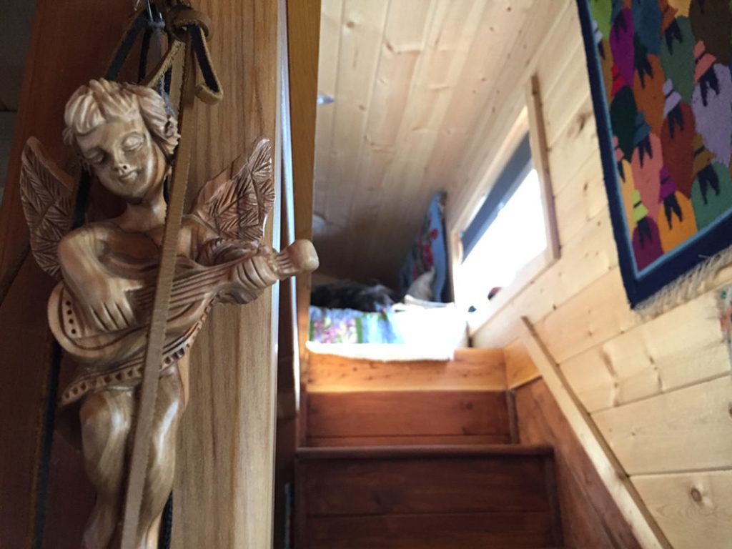 Named the “Blue Heron’s Nest”, the house has a large loft bedroom complete with queen bed and a yoga and meditation space with a vintage stained glass window from Great Britain. The loft is accessed by a staircase rather than a ladder and the house has plenty of storage under the stairs. The living area does not have a couch, but it does have a dining area for two that is also Scott’s desk and entertainment area.