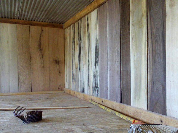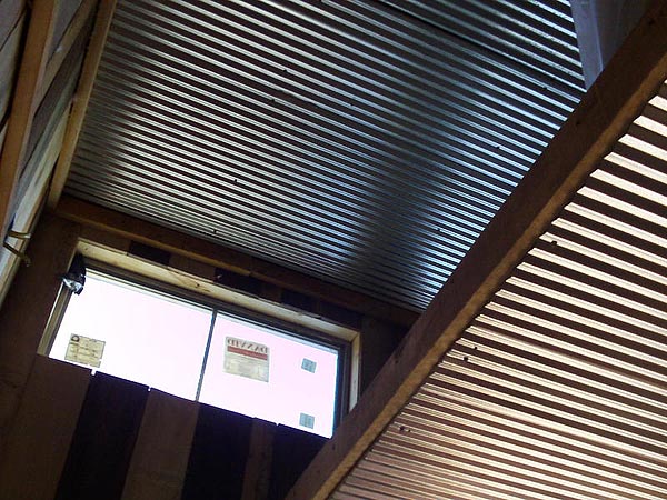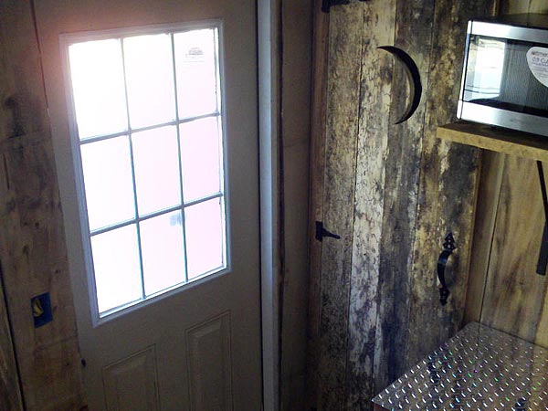 1. I just want to give a quick rundown on some of the pics, I was in such a hurry to get some interior shots to Kent and deal with the festival that I didnt realize many of the shots I sent him werent quality enough to post so there will be more , the kitchen has aluminum diamond plate top, has fridge underneath, toaster/convection oven and microwave above, bar type sink, the outhouse style door with the crescent moon cutout leads to the bathroom with shower, full size toilet and the 18″ sink/vanity. The corrugated metal shots show the ceiling both in the lower level as well as the loft, pics are before total completion as the carpet in the loft isnt installed, some trim, electrical, as well as a little more work on the porch remaining as the porch was thrown together in about an hour this morning. I really appreciate all the interest and comments on this building so far and I hope the interior shots are upto par with the response generated from the first post, thanks to Kent and all the posters, this is my favorite place on the web!