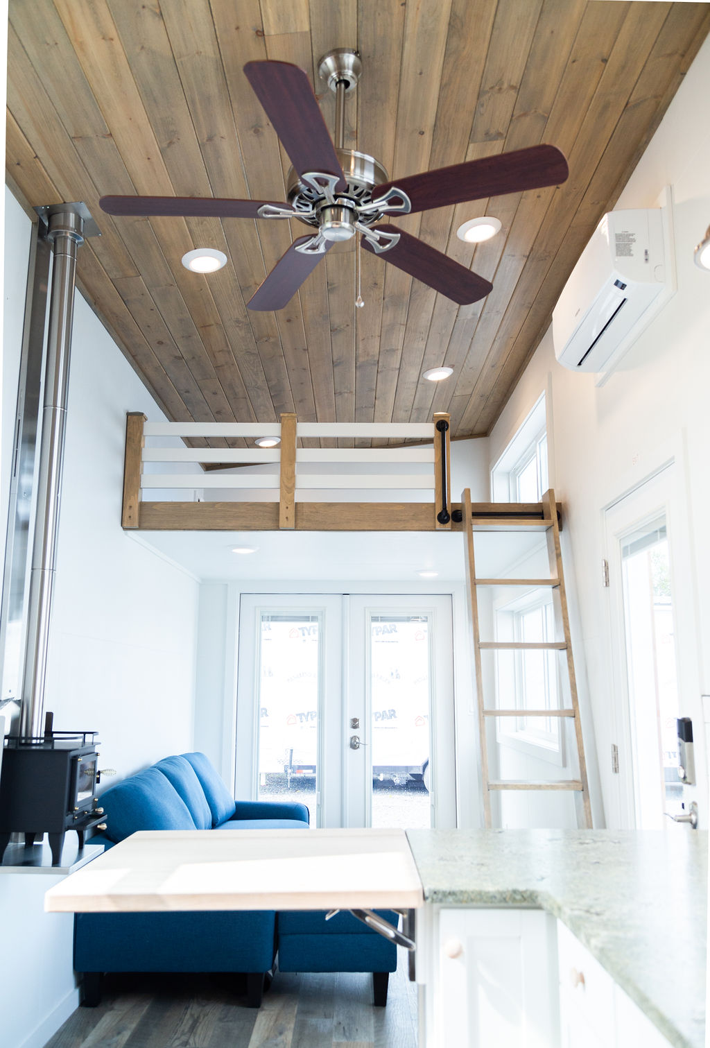- Interior Walls: Painted birch plywood w/ stained tongue & groove ship lap ceiling