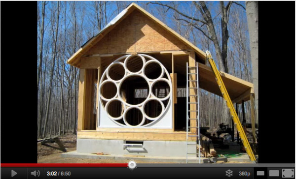 Take a look at that window. That glorious window was the catalyst for the design of Laurie Halse Anderson’s cottage in the forest. Laurie is the author of several young adult books and historical thrillers and she writes in a small cottage in the forest. She expressed her need for a “room of her own in which to write fiction”, and her video from 2009 recounts the conception and building of her writing cottage. It was built over the course of a year by her carpenter husband and several of his friends. Laurie and her family wanted it to be off-grid, made with reclaimed materials and easy on the environment.
