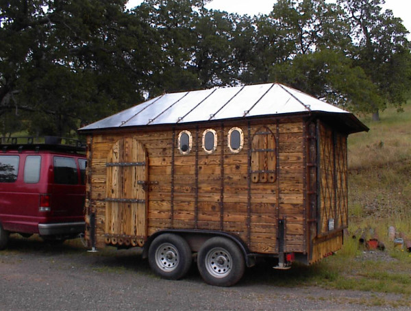 Sir James started his life as an 8×12 dual axel car trailer from California Custom Trailers. The trailer came licensed with brakes and everything for $1,700. The house was made with a welded iron “cage” and then wood, tarpaper and plywood layers were all bolted into the cage. It’s 7 feet wide by 12 feet long and it took 4 months to build. Sir James is Michel’s second of four original designs.