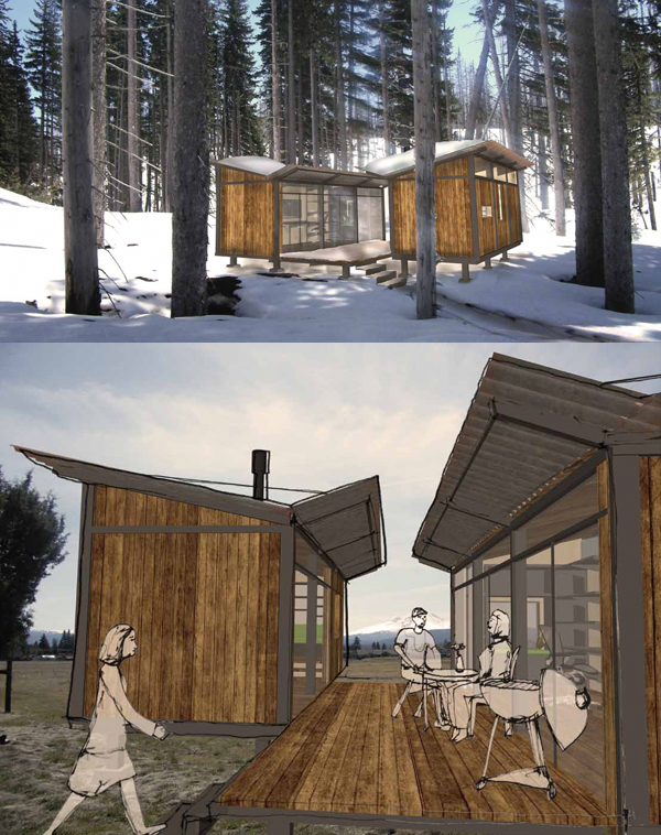 The living and working functions are separated into their own units which face a common porch providing an expansion of perceived space and a connection to the outdoors. The modular construction sits lightly on the ground and is easily transportable on the back of a flatbed truck. A steel exoskeleton provides a rugged structure to which Structural Insulated Panels are bolted, providing a continuous layer of insulation.