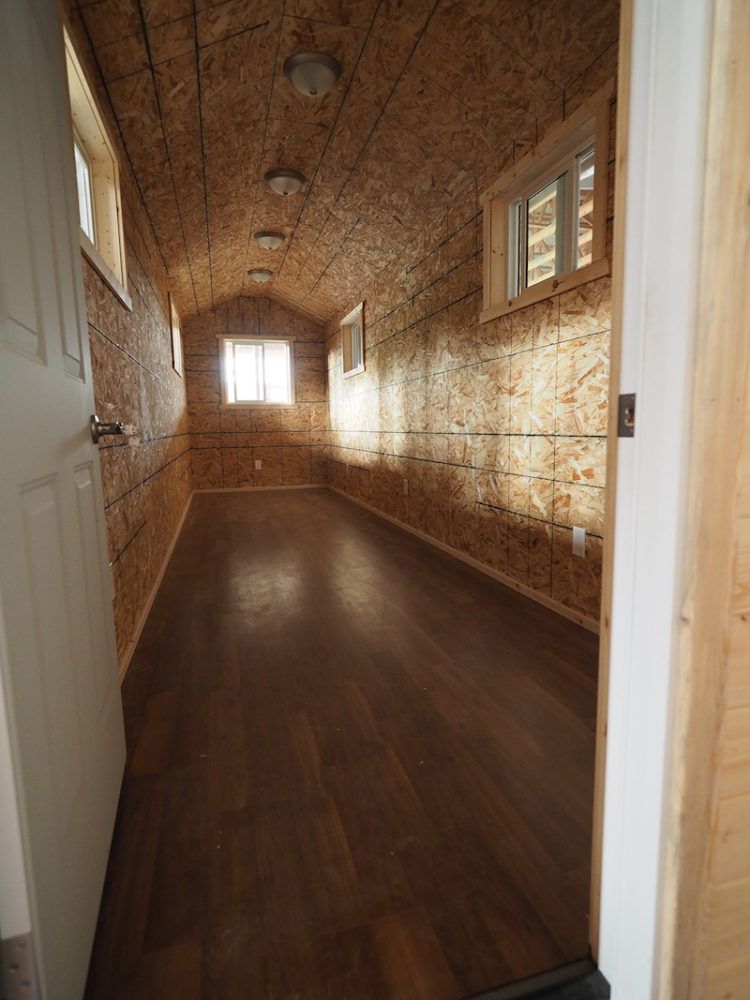 They are all undersized compared to full time living tiny homes – these are 7′ wide and roughly 11′ in height. They come with standard 30 amp service, pine siding, basic R14 insulation and laminate flooring. There is no heating, water or lofts on the inside, just an empty shell. The openings on both 16′ tiny homes are assisted by gas shocks and are easy to open and close for anyone.
