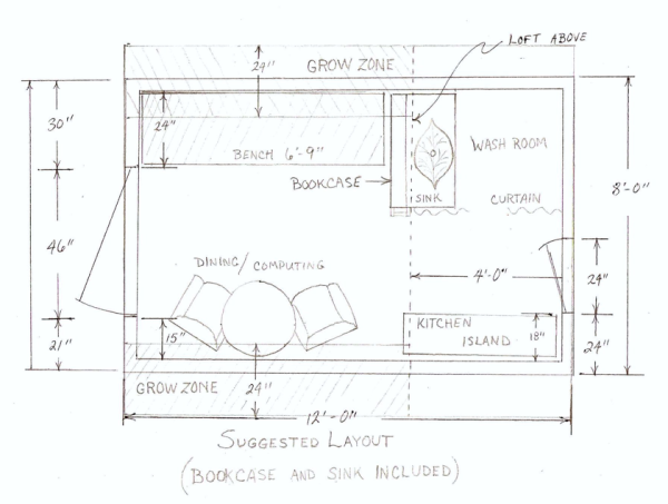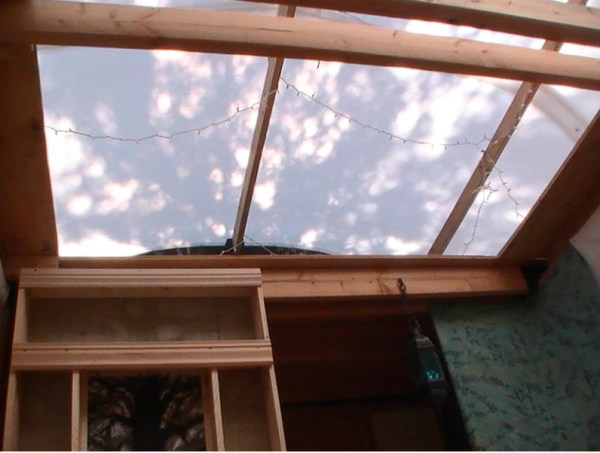 The interior is 10 foot high with 5 mm Solexx brand green house covering for the roofing. The base is 8 feet by 12 feet, therefore, 96 square feet total floor space. The sleeping loft is 4 feet wide by 10 feet long by 3.5 feet high.