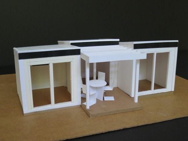 A third cube is designed for a more permanent location and provides a full-size bathroom with a sink, tub/shower and toilet. A louvered pergola can be built between the three cubes to provide an outdoors dining area for entertaining.