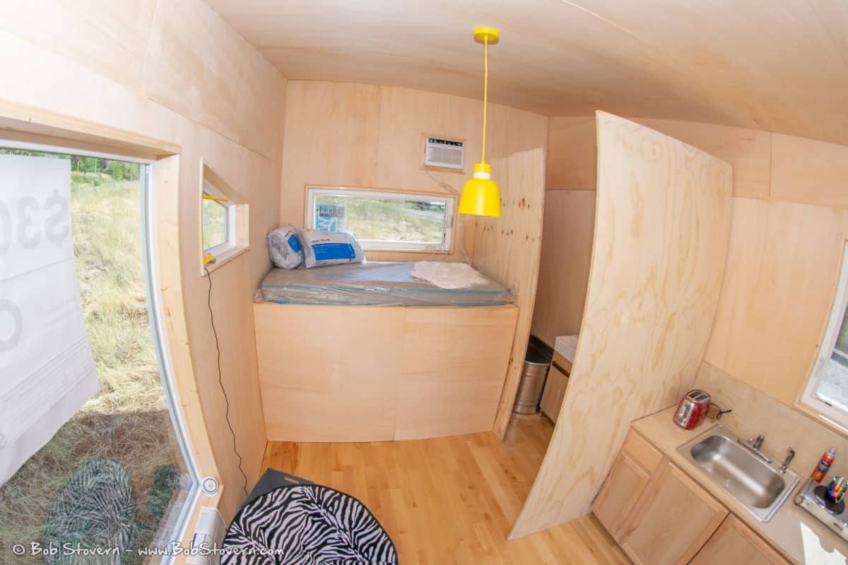 FEATURES: Birchwood interior, Canadian Birch hardwood floor, insulated floor, roof insulated to R30, metal roof, mini bathroom, kitchen, raised bed (with storage underneath), 5,000 BTU air conditioner, custom windows, slider door with built-in shades,