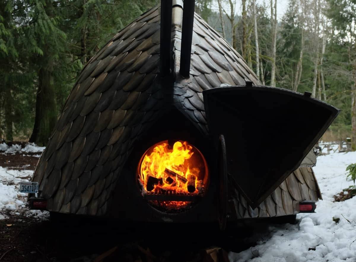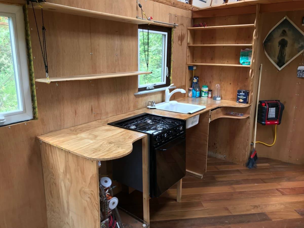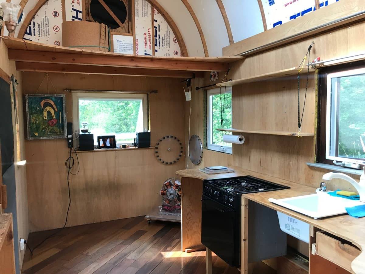 Solid all-wood tiny house on a trailer, off-grid, cedar shake roof, entry French door, lots of light. The interior walls have thin tongue and groove pine interior cladding over foam board insulation, solid oak flooring, insulation in the vaulted ceiling is denim batting Ultratouch and finished with lightweight birch door skin ceiling panels on the vaulted ceiling above kitchen/dining area, kitchenette with quartz cream-colored countertop, stainless steel tea sink and a grey water drain, custom cabinets with pull out shelves. The woodstove is Norwegian Jotul F602 with a glassed door providing a beautiful view of the fire, and a single stove top suitable for a large frying pan, soup pot, or kettle. The wall has handmade Spanish tiles. There is a narrow stairwell to the loft bedroom, fits a queen or double size bed. The cabin has simple passive heat qualities if you site front door and window facing south, and the solid wall on the north side. There are no plastics in the interior or exterior. The U-shaped seating area that converts to narrow beds has built-in storage. Light is provided by battery lanterns. There is no bathroom.