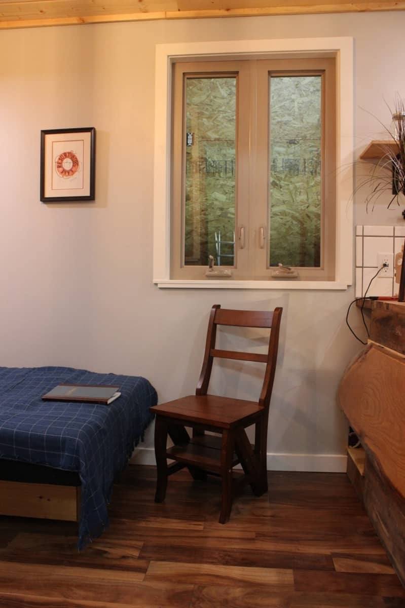 A live-edge folding table provides for comfortable seating for 2 or a nice desk for an office. Flexibility and fine finishes are the key features of this tiny house.