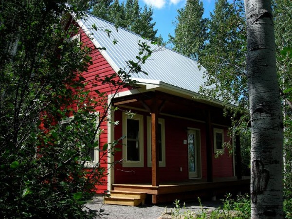 He is extremely private, so I can’t tell you where it is located other than the inter-mountain west. It has a lovely compact kitchen and sleeping loft, with hot tub out back. The entire front has a porch for sitting and shooting the breeze. When we visit in our RV, we stay up the road a piece on national forest land, and leave him to his private, peaceful hideaway. -Louise