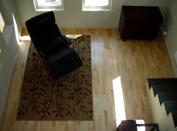 The one of the living area shows just about exactly half of the total downstairs area. I figure that rug is 4′ x 8′? (Feel free to move these photos into the main post if you wish.)
