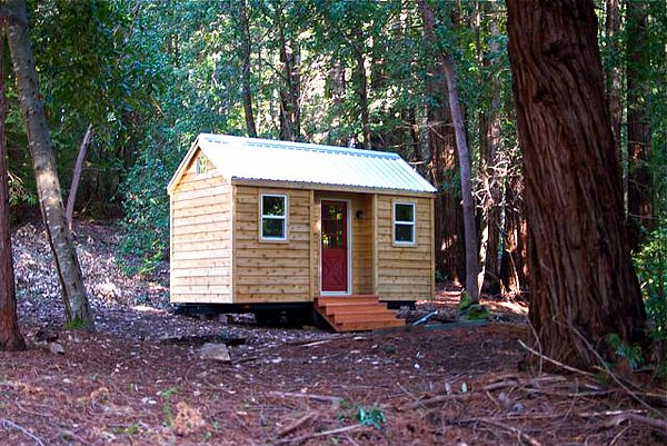 We made the decision that whatever we did next would not entail working with a bank or getting a mortgage (made next to impossible by how badly our credit as been damaged, anyway) – so we searched for a piece of land that was for sale by owner at a reasonable price, and stumbled onto the property you see in the photo. About two weeks ago, I found a tiny house for sale by a wonderful man named Jeff; he drove it to the Santa Cruz Mountains from Sebastopol, and we became proud “outright” owners of our very own house. The interior is just one big room, and still needs to be outfitted, which is going to be a lot of fun (and work). I will keep you updated, and wanted to let you know that this web site and the information you provide has given us so much inspiration to make the move from a 2,000 square foot house to a 130 square foot one! Ultimately, we are going to build a “not so tiny house” of about 800 square feet, but that is down the line…