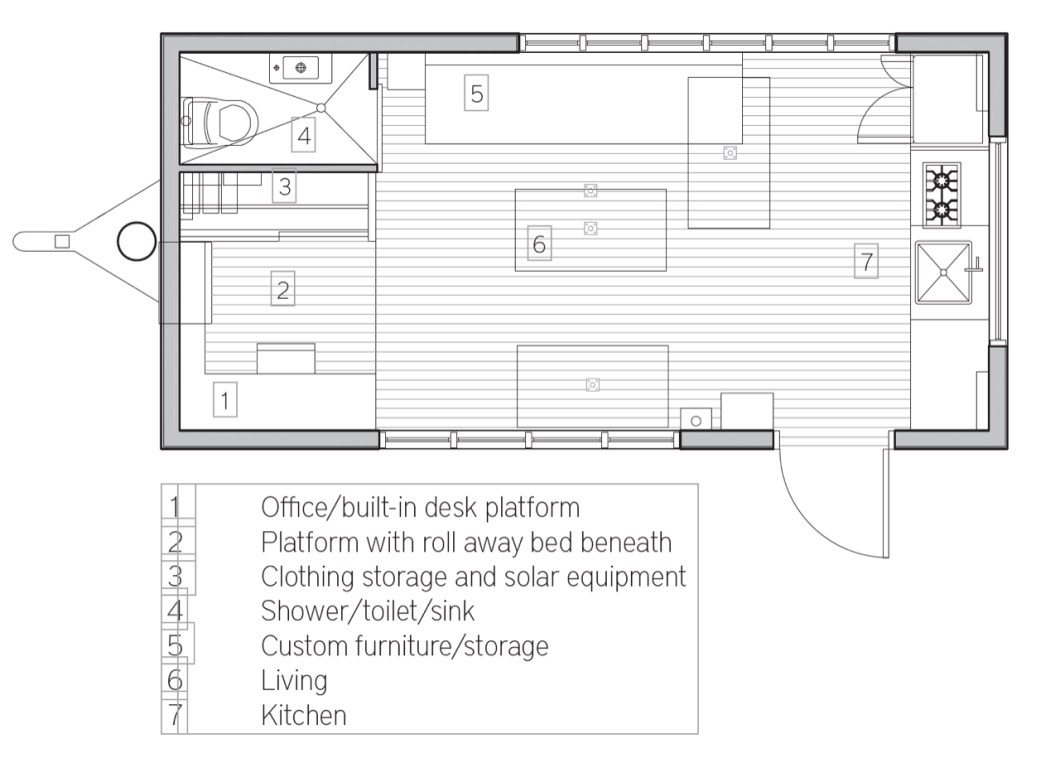 For heating there’s room for a Dickinson propane fireplace and wall panels, for cooling we’ve hidden a through-the-wall A/C into the desk shelving (you could alternatively put in a mini-split). The bath is a ‘wet bath’ and accommodates any type of toilet desired. We also include all the specs to make Minim fully off-grid with a solar array, battery bank, propane heat, and rainwater collection/storage/treatment.