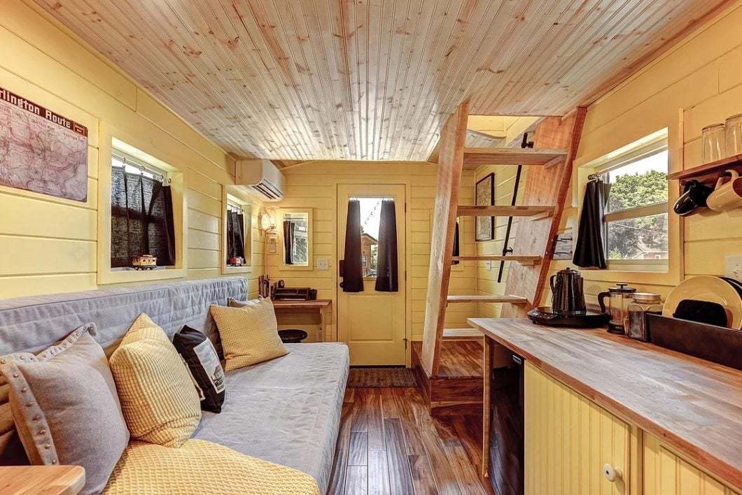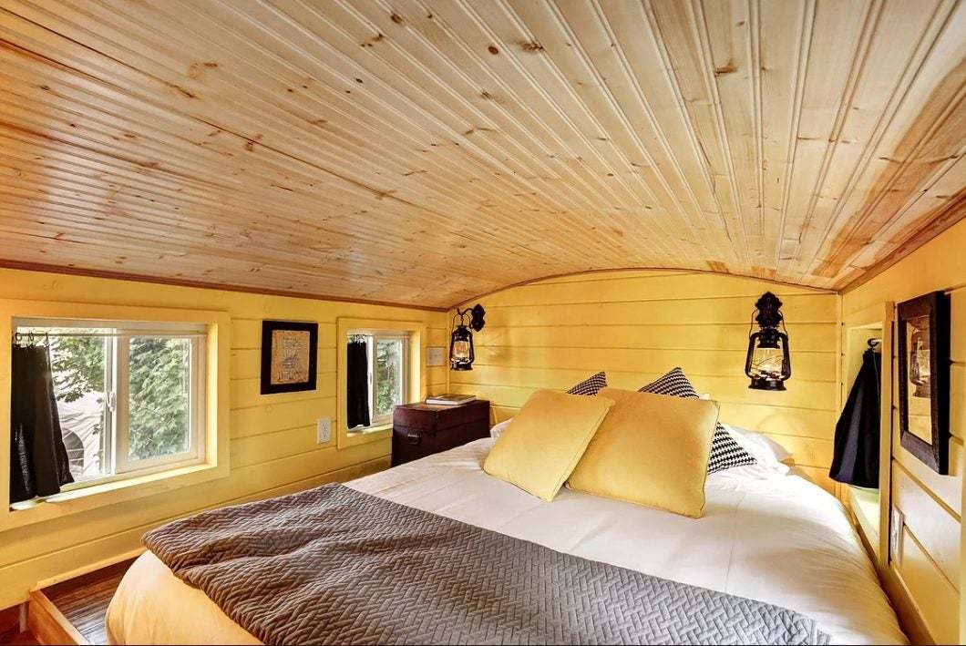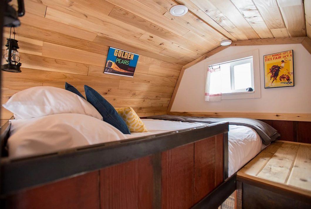 Almost like riding the rails! Stepping into our cheery yellow train car feels like starting a mini adventure – even if the scenery outside the window doesn’t change. The Arthur tiny house is named for Pam’s Grandfather who had a passion for trains.