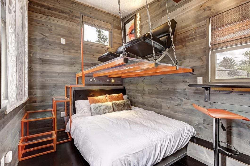 Expect the unexpected in this retro-modern escape with a slanted roof, vertical wood siding and metal accents. Dashes of bright orange stand out against the clean lines and cool gray interior, but it’s the see-through seating area suspended over the sleeping area that adds the real drama.