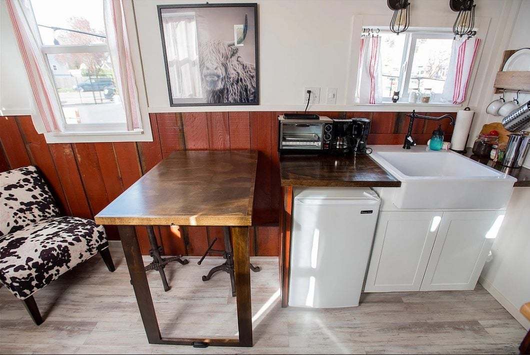 Our little red Barn tiny house offers all the fun of a farmhouse stay, but with none of the dirty work. A custom-built Dutch barn door welcomes you into the open front living area which is paneled with reclaimed 100 yr old barn wood wainscoting.