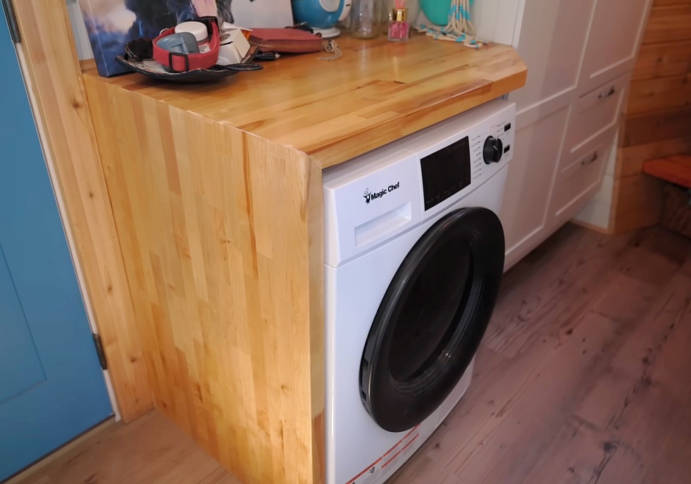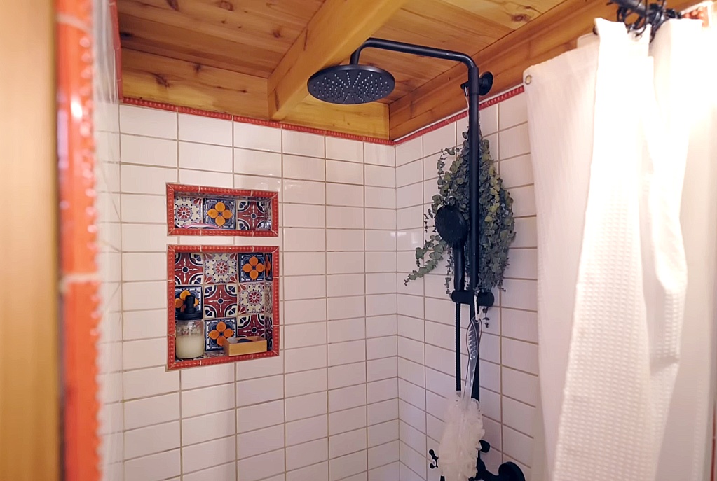 Korallus Tiny Homes built a gorgeous 220-square-foot tiny house on wheels for Sofia and her sweet dog, Veto. It has an open layout yet a space-efficient design that provides an impressive amount of storage space. Two things that make this customized Aspen model stand out include beautiful finishing work with locally sourced wood and hand-crafted tiles.