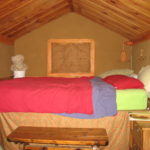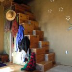 “My favorite things about the house are the unique artistic touches that give it character,” Kassandra went on, “like the shell and glass mosaics,” made with objects Bear and Alyssa found while beachcombing in Mexico, “that were inlaid in the plaster. As a housewarming party when I moved in, I invited the whole community to come and paint a mural on the east wall; everyone came and made a contribution. The mural is beautiful, and I love it – for me it symbolizes the spirit of community that we have here at Dancing Rabbit Eco-village.”