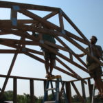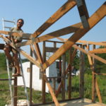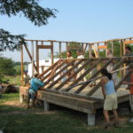 “I wanted the foundation for the building to be as non-invasive to the soil as possible, so I chose to build the house on concrete pylons rather than a slab,” Bear explained to me. “This also spared unnecessary expenditure of Portland cement, which accounts for a huge portion of global CO2 emissions.” Bear adopted a wide-eyed, sober expression as he went on, “that year, we had very little rain – the clay soil so was dry and hard that we could not dig holes for the pylons with our manual auger. We had to dig a small portion by hand, fill it with water to let the ground soften, then dig a little further and repeat this process until the holes were deep enough.” He laughed and went on, “we had a dance party to celebrate the completion of the pylons and the wood decking of the floor. Of course, a Missouri Monsoon swept through and we all had to rush to cover the wood with tarps to protect it from warping.”