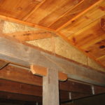 The second floor sleeping loft is gabled with scissor trusses that taper to side-walls just five feet in height. “We were limited by the dimensions of the reclaimed timbers we were able to obtain at that point in the construction,” Bear remarked. “We had a limited number of timbers and could not afford to trim them to specification; we instead cut them in half in order to produce enough to finish the walls without any wasted lumber.” The roof is clad in standard metal sheeting. “The roofing panels were one of the few materials we purchased new. I don’t recommend using recycled roofing for projects like a family dwelling – it is impossible to adequately fill all of the holes created in the prior installation of the panels, and this will inevitably lead to leaks in the roof. A leak may be present for a long time before it becomes noticeable, and by then the damage is likely to be extensive and require major repairs.”
