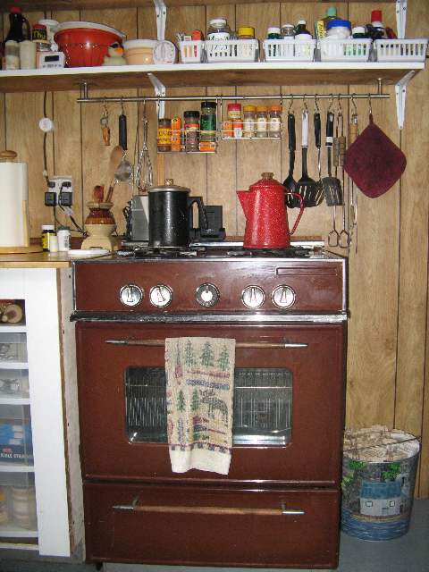 When John built our cabin he installed a hand pump. It draws water from about six feet below the lake surface. To be safe, we boil it before drinking. Continue around the L-shaped counter and there is my small stove and oven. Open wall shelves hold our dishes and food. Under the counter are two plastic drawer units. To deter mice, we keep foodstuffs in containers, especially when we aren’t there. But we’ve been very lucky so far.