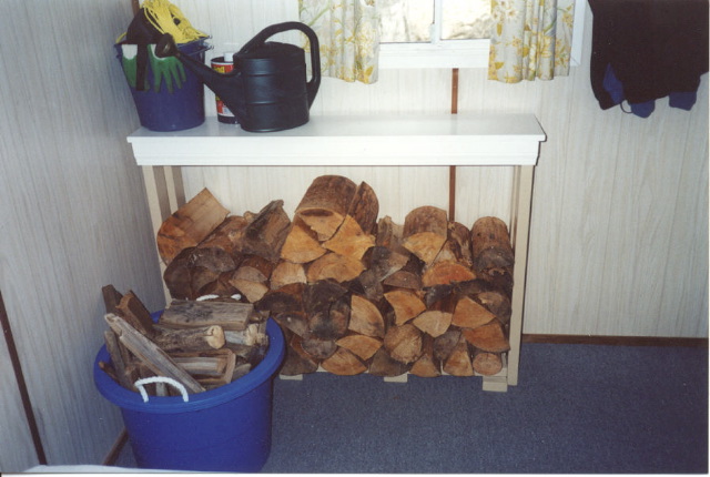 Storing wood on our cabin’s float is problematic. We want it close by, but not weighing down the foundation for our cabin. Our floating woodshed and a small covered woodpile on our transition float to shore serve this purpose well. For those really rainy and windy nights, we have our small indoor wood shelf that holds about 5 days worth of really dry wood. It takes up a little space in our “guest room,” but no one seems to complain.
