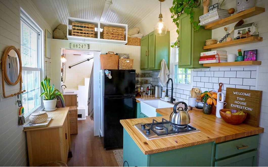Jessica and her dad built a 24-foot-long tiny house on wheels. When designing and building it, they aimed to create a home that looked professionally done. With that in mind, a clean aesthetic was a top priority. They used lots of white with sage green accents. Additionally, Jessica wanted a tiny house layout with distinct rooms that had a natural feeling flow. The L-shaped kitchen, for instance, creates a sense of separation between the living room. A small home office nook separates the kitchen and the bathroom (plus a pocket door!).