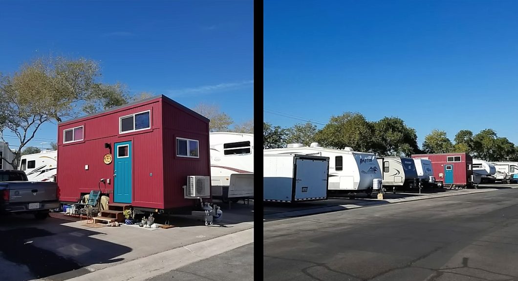 For those interested in living in the Southwest, Brenda recommends carefully choosing exterior materials for your tiny house that can withstand extreme heat and sun exposure. Her home on wheels featured painted T-111 plywood, which held up exceptionally well with no color fading. However, her Just B Tiny stained wooden sign cracked in half after months of intense dry weather and UV rays in Vegas.