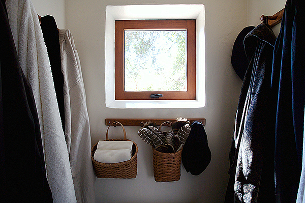 The bathroom has a toilet and a little stool for sponge bathing, with a drain in the tiled floor. Shaker-style pegs serve the traditional purpose, and are a welcome addition to the closet in the loft.