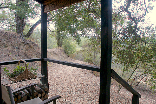 The porch also shelters our firewood from fog drip and rain. Because the house faces south, we use reed blinds to provide adjustable shelter for ourselves from the sunlight. Glare is actually an important problem to solve in the dimly lit interior of a woodland cabin, where the windows are traditionally small and few. In the old log cabin where we lived years ago it was positively dark during the daytime. So we spend a lot of our time out on the porch, eating, talking, reading, working, just as people used to do. There is a deer trail along the rise in the land to the left, where deer and coyote and bobcat come and go. If you are still and raise your hands before your face with your fingers spread, the deer don’t realize you’re there.