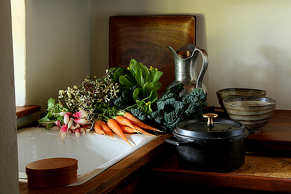 The arugula—which has here gone to flower—will go into a vase for a day or two, then into the cooking pot. We are fortunate to live near a year-round farmers market in a year-round growing climate, where we have plenty of changing produce available in every season. Other than the lettuces, everything will last until next week’s market day.