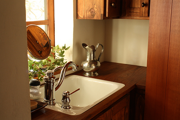 Without a stove or refrigerator, food preparation becomes very simple. All food is kept in the cabinets above, utensils and other necessaries in the cabinets and drawers below.