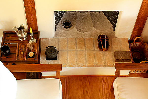 The metal trivet in the fire box is where we heat water in the iron kettle and cook meals in our cast iron pot. Cast iron heats slowly but then cooks evenly, making every covered pot an oven in itself. The basket to the right of the hearth is where we keep the day’s firewood. The tray on the table to the left holds implements for making powdered tea or chocolate. This is our room for conversation. We sit here across from one another, between the books and the fire.