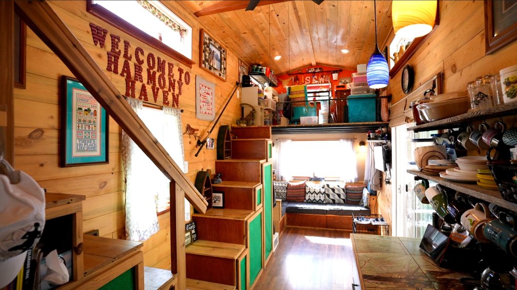 As Kathi and Jim will admit, they are not minimalists. They maximized the storage space in each ‘room’ in their tiny home with cabinets, cubbies, under-shelf hooks, and more. They also talked their builder into adding dual stairs for easy access to the upstairs and for more storage.