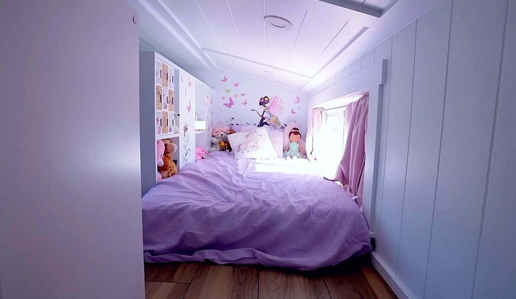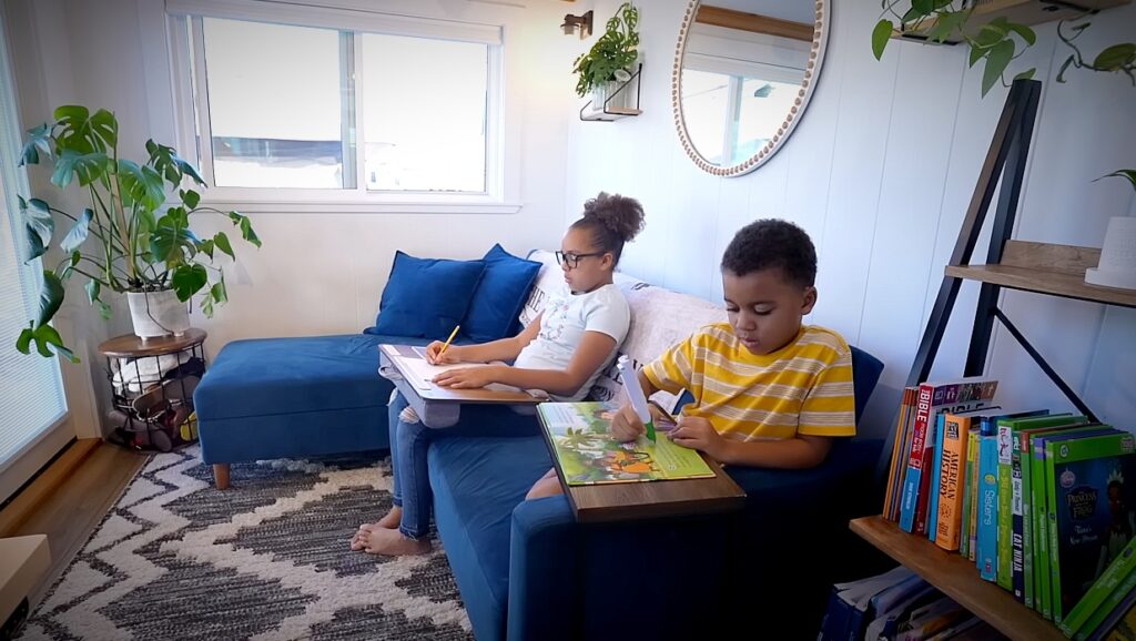 Their family-size tiny home features two lofts. One acts as a classroom/playroom, and the other serves as a bedroom. It’s divided, so Sanaa and Simeon can enjoy semi-private space on either side. In the future, they can each have their own completely separate loft bedroom.